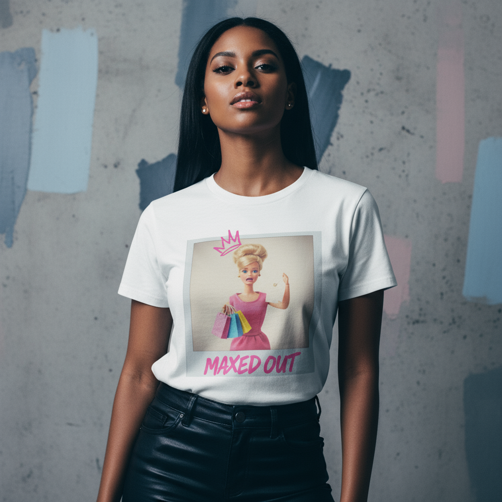 Warning: card declined, confidence intact. The Maxed Out Tee channels pure meltdown energy. Shopping bags in hand, receipt nowhere in sight. It’s a moment of retail denial, glamorously worn.