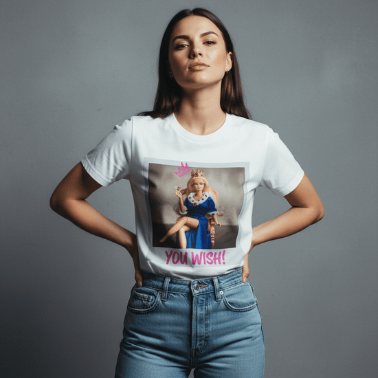 Rule the moment with the You Wish! Tee - a statement piece for those who sit pretty, sip martinis, and serve power with a wink. Featuring a crowned queen perched on her throne with legs crossed and standards high, this design channels unapologetic authority and undeniable charm.